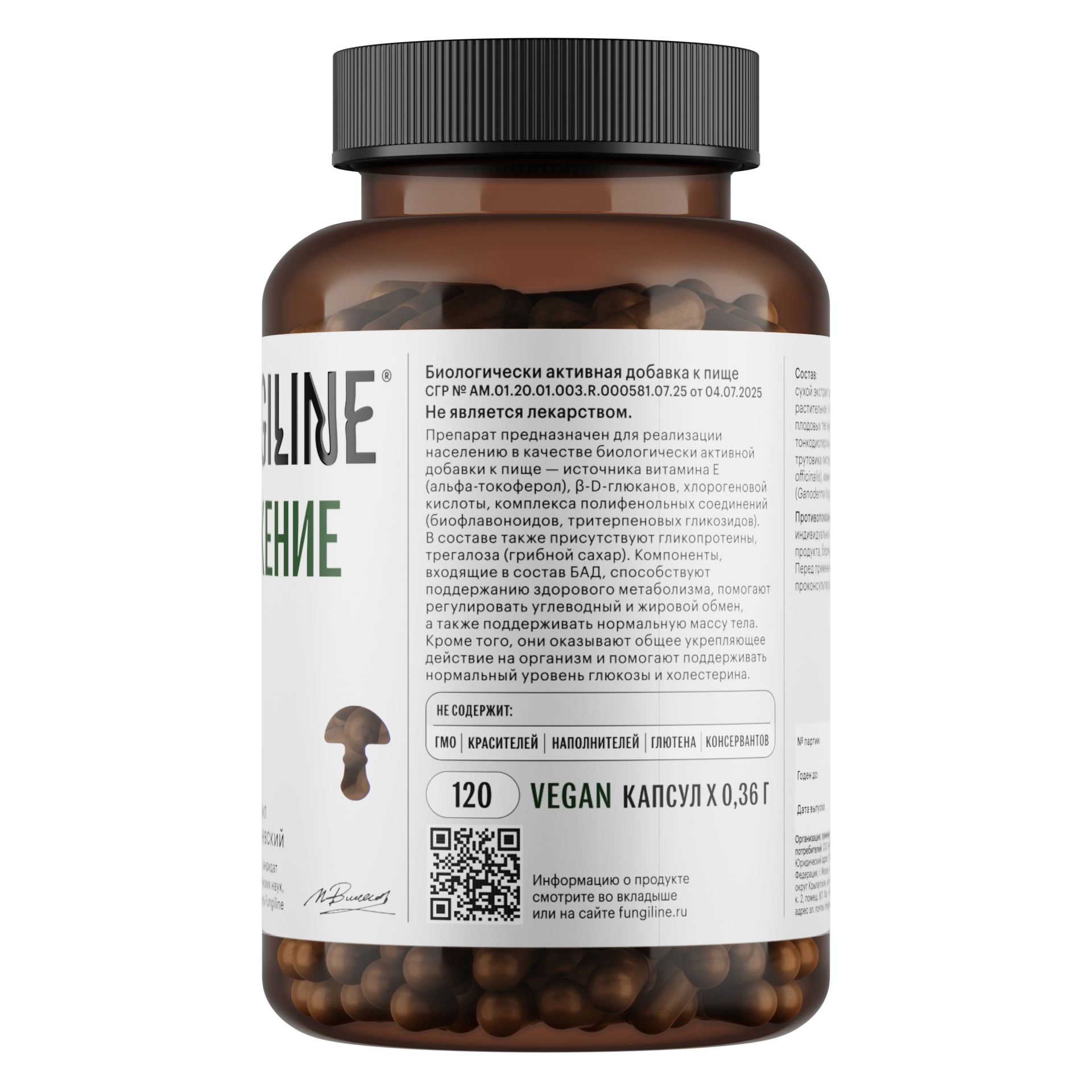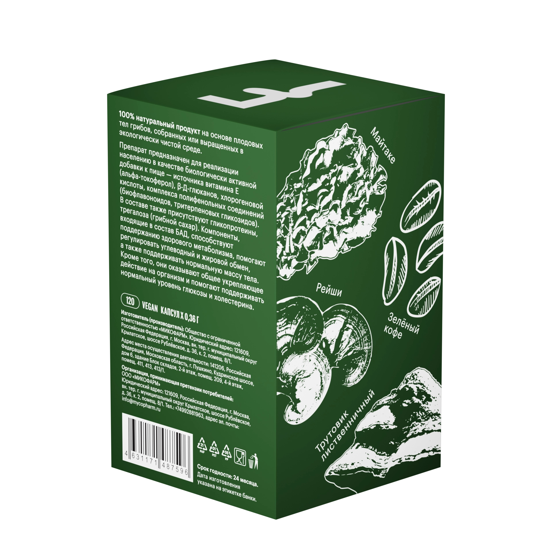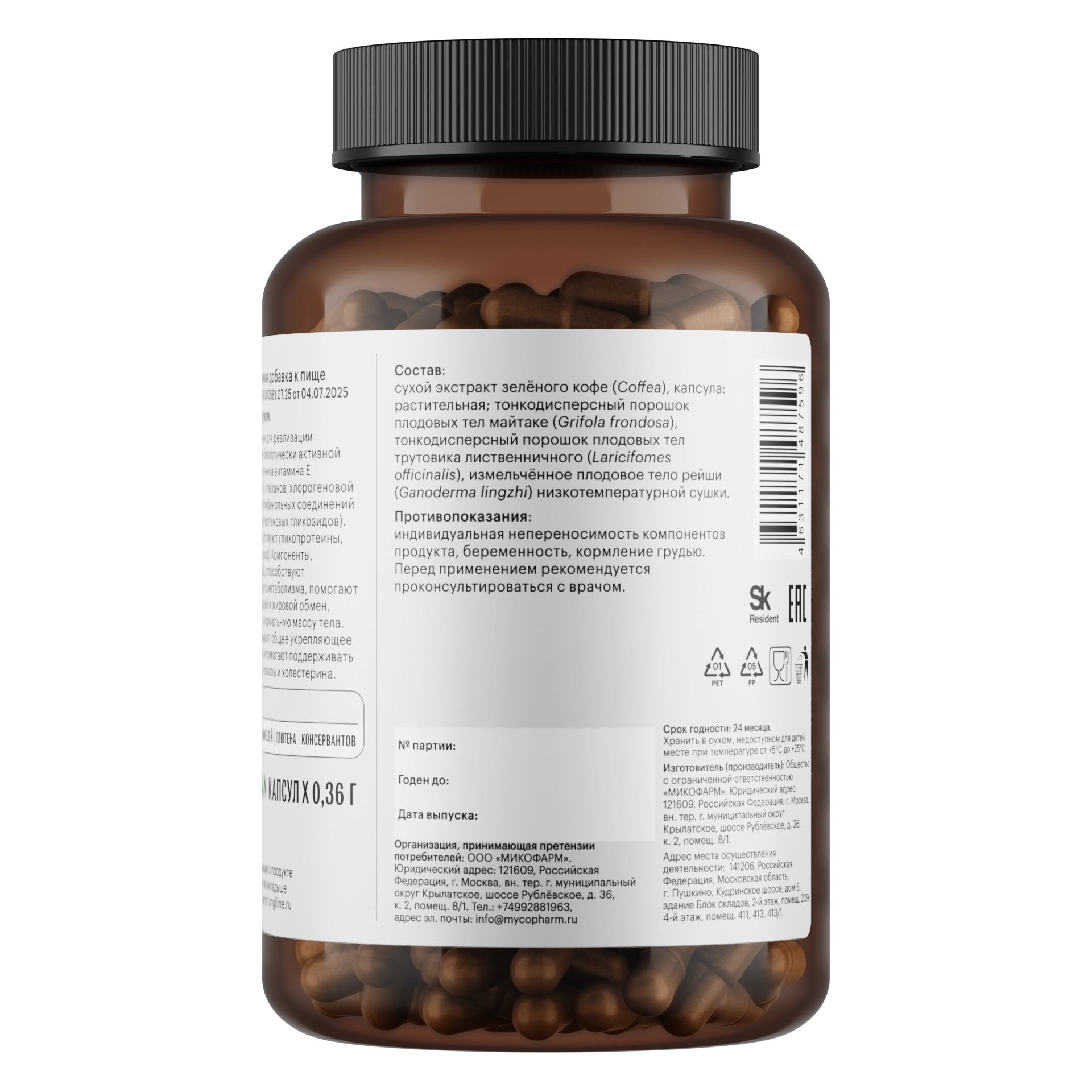 Тонкодисперсный порошок плодовых тел майтаке (Grifola frondosa), трутовика лиственничного (Laricifomes officinalis) и рейши (Ganoderma lingzhi) низкотемпературной сушки; экстракт зелёного кофе (Coffea).
