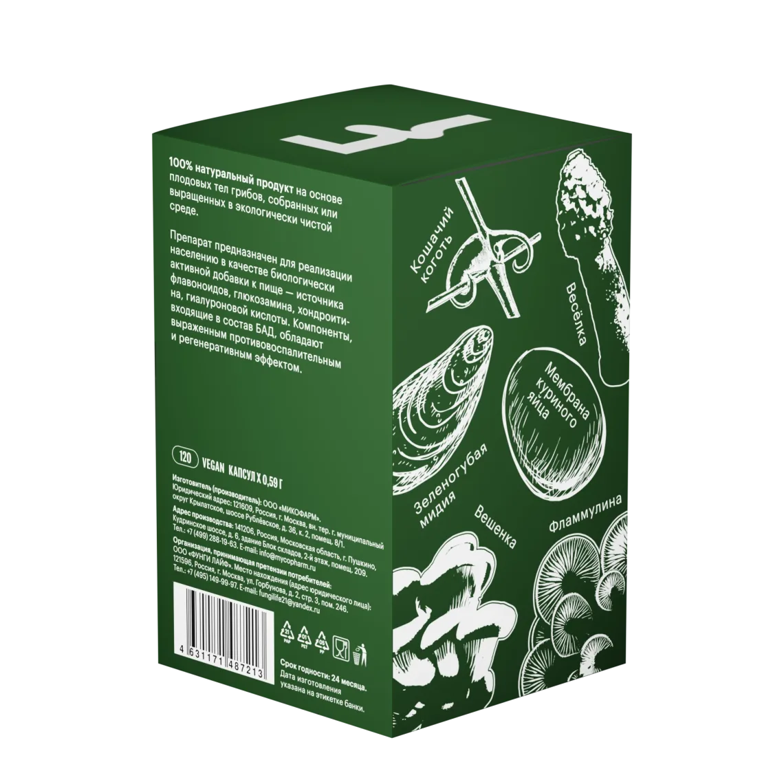 Тонкодисперсный порошок плодовых тел вешенки устричной (Pleurotus ostreatus), фламмулины (Flammulina velutipes), весёлки обыкновенной (Phallus impudicus) низкотемпературной сушки; порошок мембраны куриного яйца, мясо зелёногубой мидии; растительный экстракт кошачьего когтя (Uncaria guianensis).