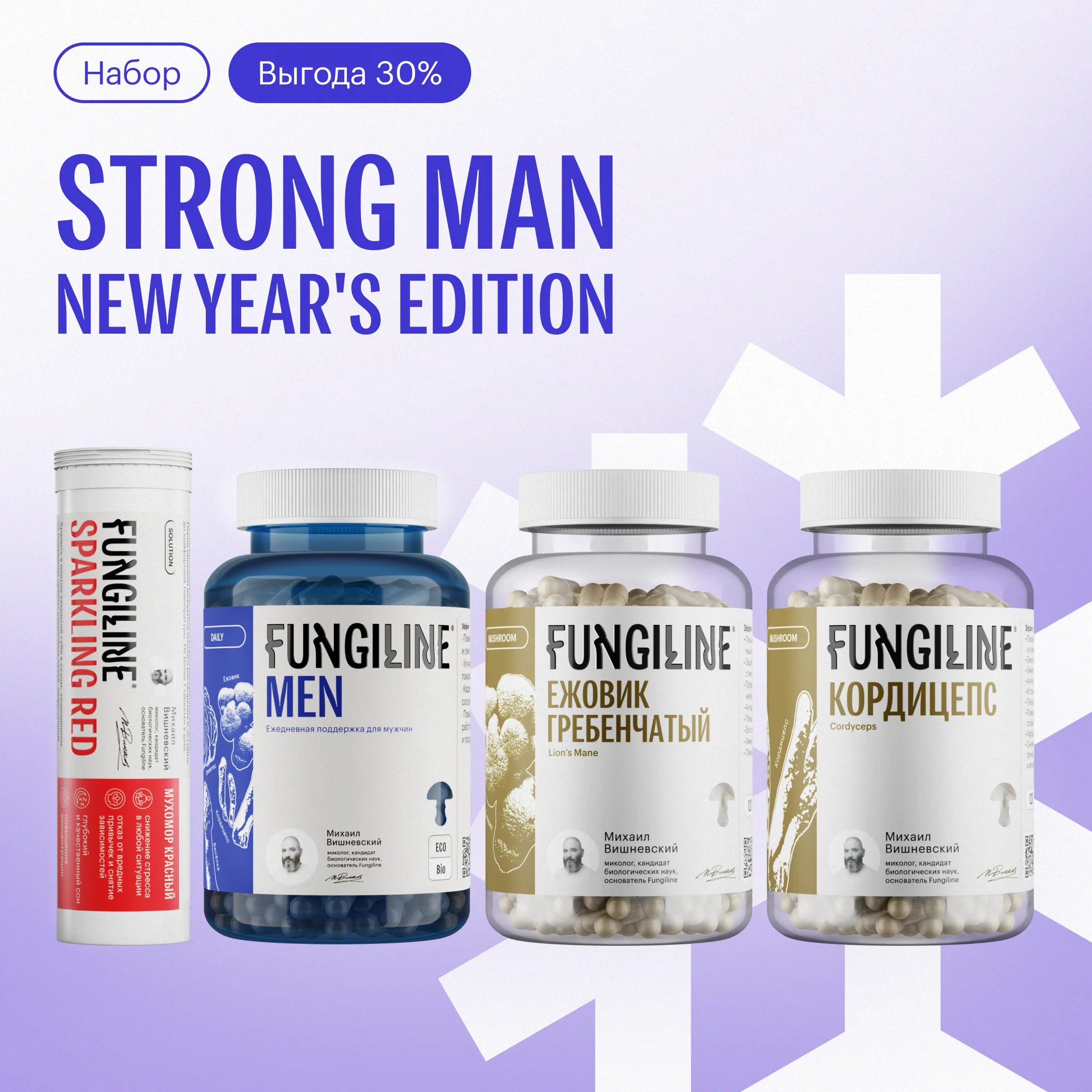 Подарочный набор для мужчин «Strong Man: New Year's Edition» • Sparkling Red (14 таблеток) + Daily Men (120 капсул) + Ежовик гребенчатый (120 капсул) + Кордицепс (120 капсул) купить в Казахстане. Грибная аптека Михаила Вишневского